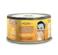 Ingredientes: Pato 35 %, pollo 32 %, caldo 29 %, aceitunas 3 %, vitaminas y minerales 1 %.