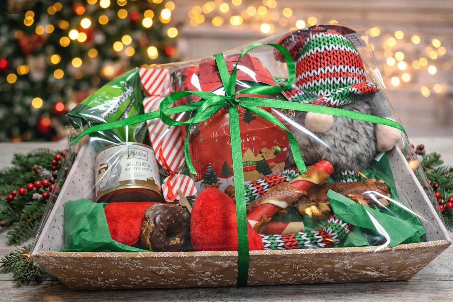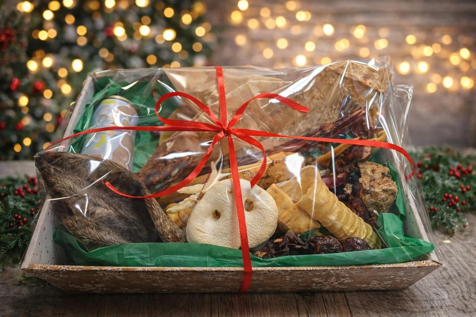Incluimos una combinación equilibrada de masticación natural, latas de alimentación húmeda de calidad, snacks especiales, juguetes y detalles navideños, siempre adaptados al presupuesto y pensando en el disfrute y las necesidades reales de tu perro.