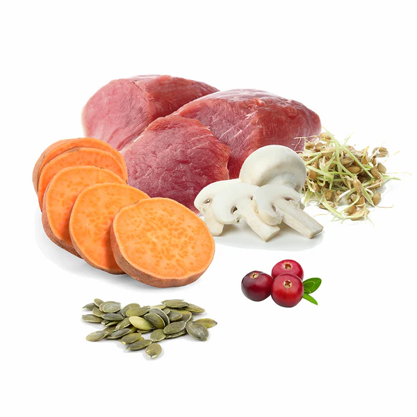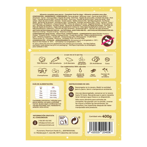 Composición: Carne de jabalí (55%), zanahoria (16,8%), hígado de cerdo (7%), corazón de cerdo (5%), pulmón de cerdo (4,5%), bazo de cerdo (3,5%), boniato (2,4%), arándanos rojos (2%), semillas de girasol, coco, champiñones (0,5%), cáscara de huevo, semillas de calabaza, aceite de hígado de bacalao, algas marinas (ascophyllum nodosum), germen de trigo sarraceno