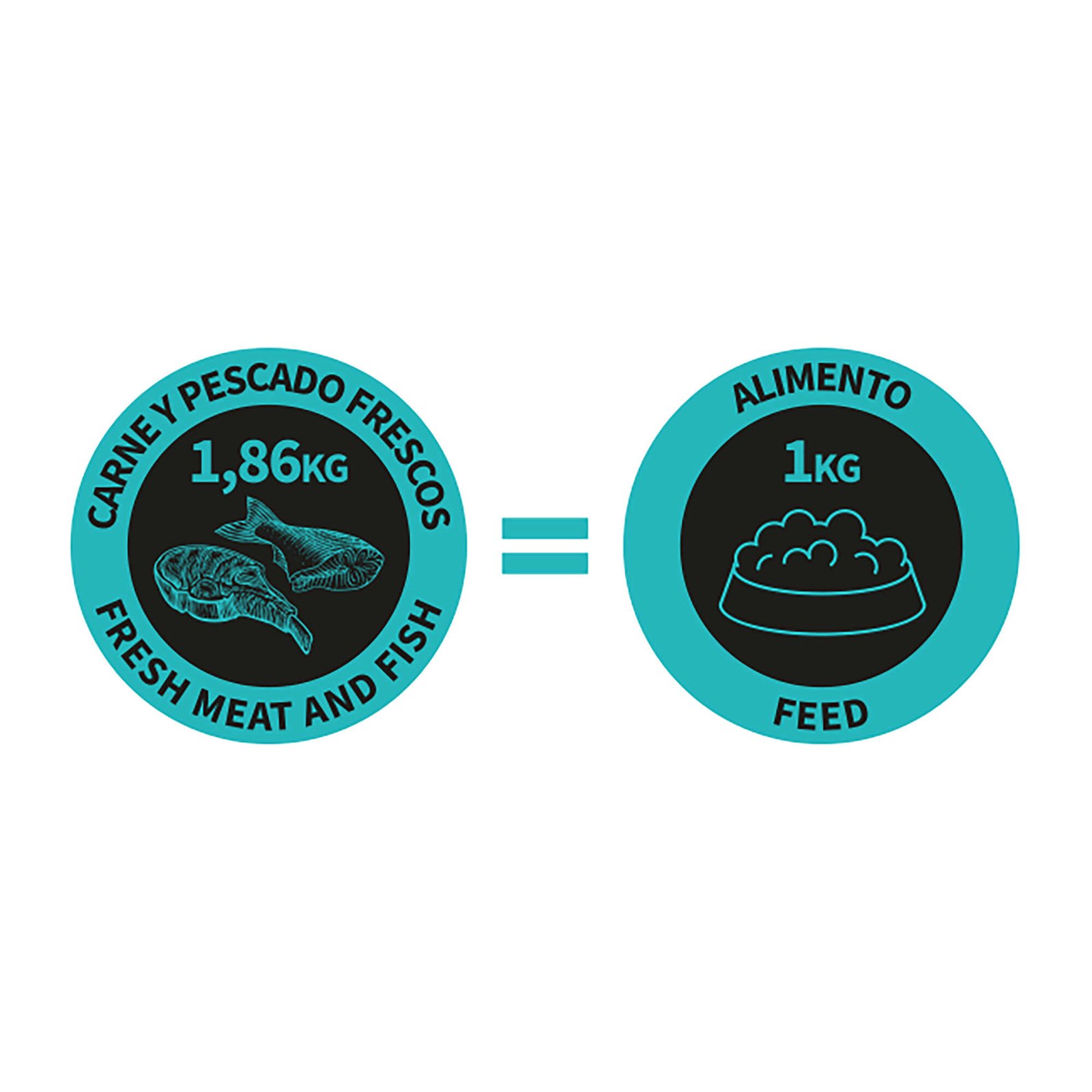 Ingredientes: 55% pescado fresco (alacha Sardinella aurita, caballa Scomber scombrus, jurel Trachurus spp., sardina Sardina pilchardus), 20% pollo fresco, almidón hidrolizado, tocoferoles de aceites vegetales, extracto de romero, huevo deshidratado, aceite esencial de orégano, tomillo, clavo, romero, canela Ceylán.