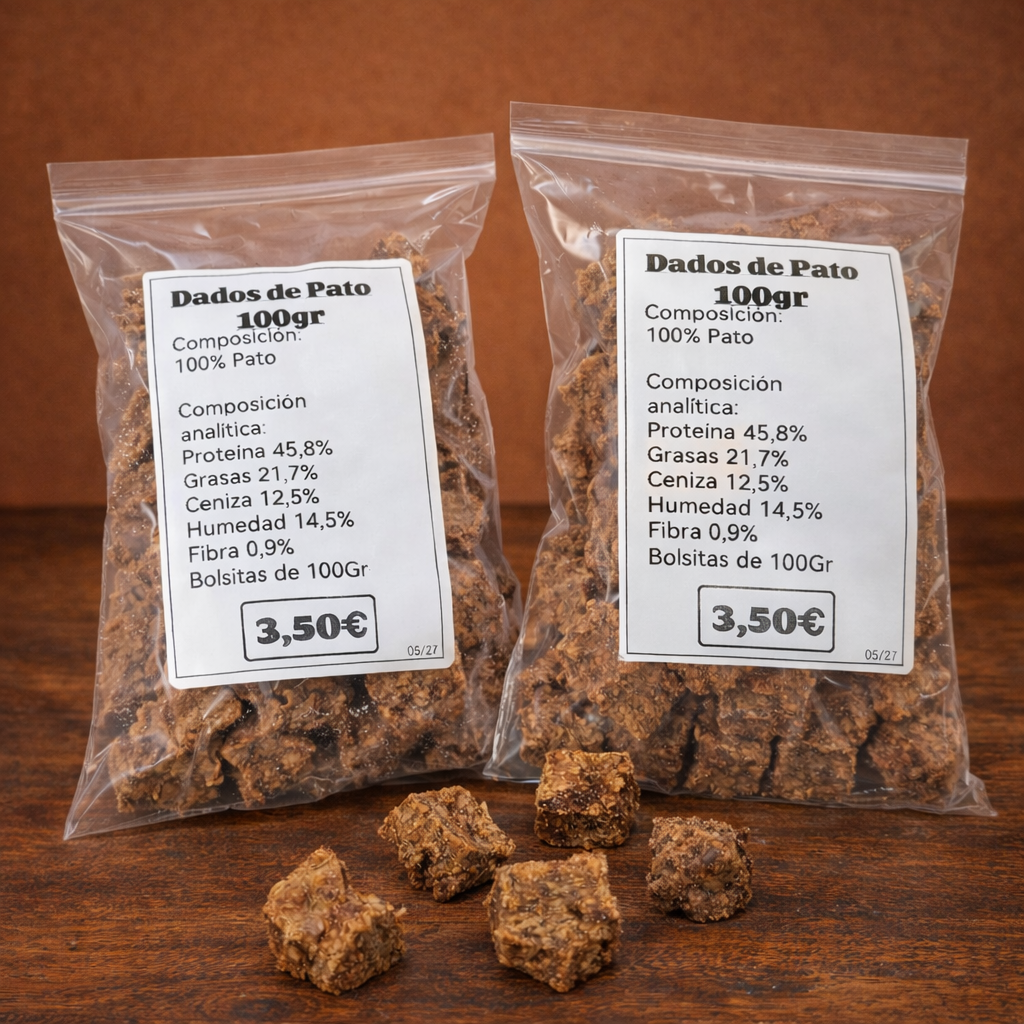 Dados de pato naturales para perros, elaborados con proteína de alta calidad. Snack saludable, sabroso y fácil de masticar, ideal como premio o chuche. Sin aditivos artificiales, favorece una alimentación más respetuosa y consciente.