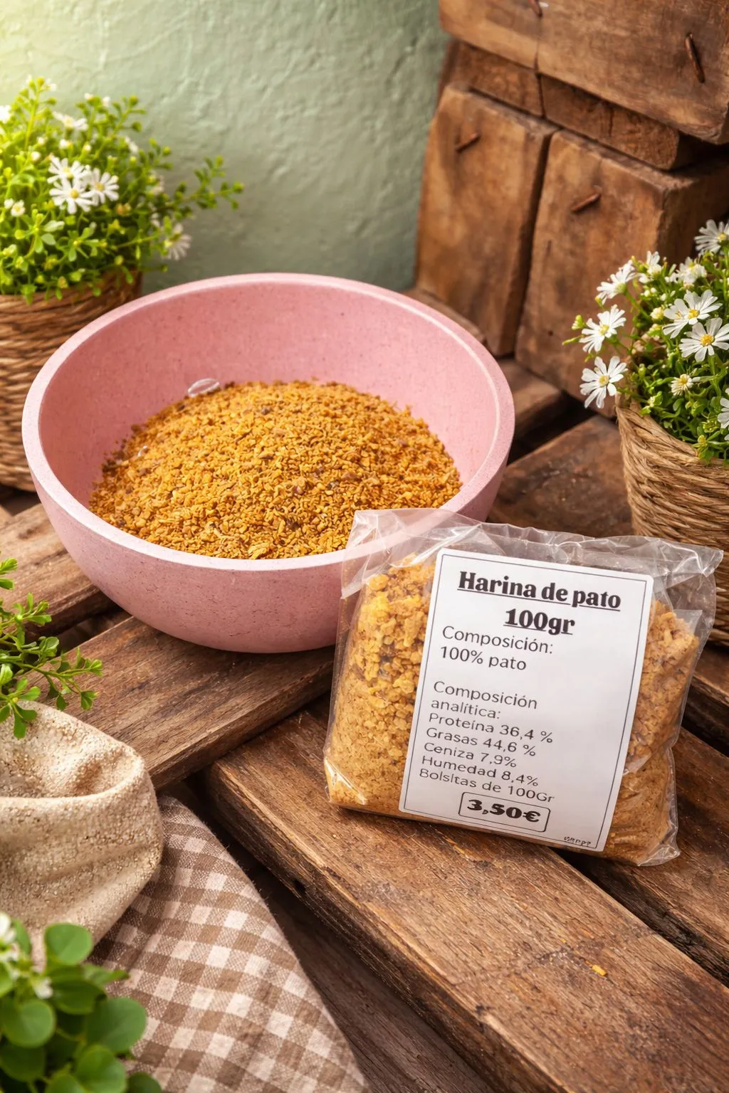Harina de pato natural para perros, ideal como topping para realzar el sabor de la comida y estimular el apetito. Fuente de proteína de alta calidad, sin aditivos ni conservantes, perfecta para enriquecer una alimentación saludable y consciente.