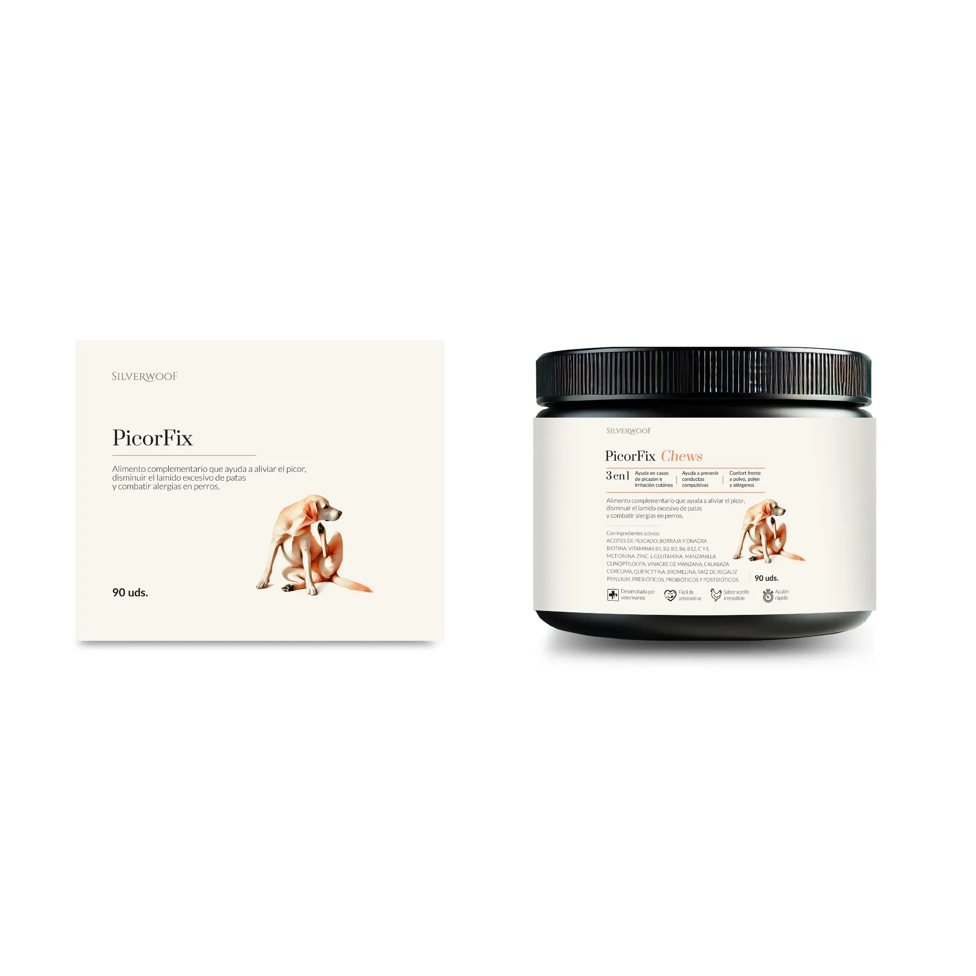 Ingredientes activos: aceites de pescado, borraja y onagra, biotina, vitaminas B1, B2, B3, B6, B12, C y E, metionina, zinc, L-glutamina, manzanilla, clinoptilolita, vinagre de manzana, calabaza, cúrcuma, quercitina, bromelina, raíz de regaliz, psyllium, prebióticos, probióticos y postbiótios.